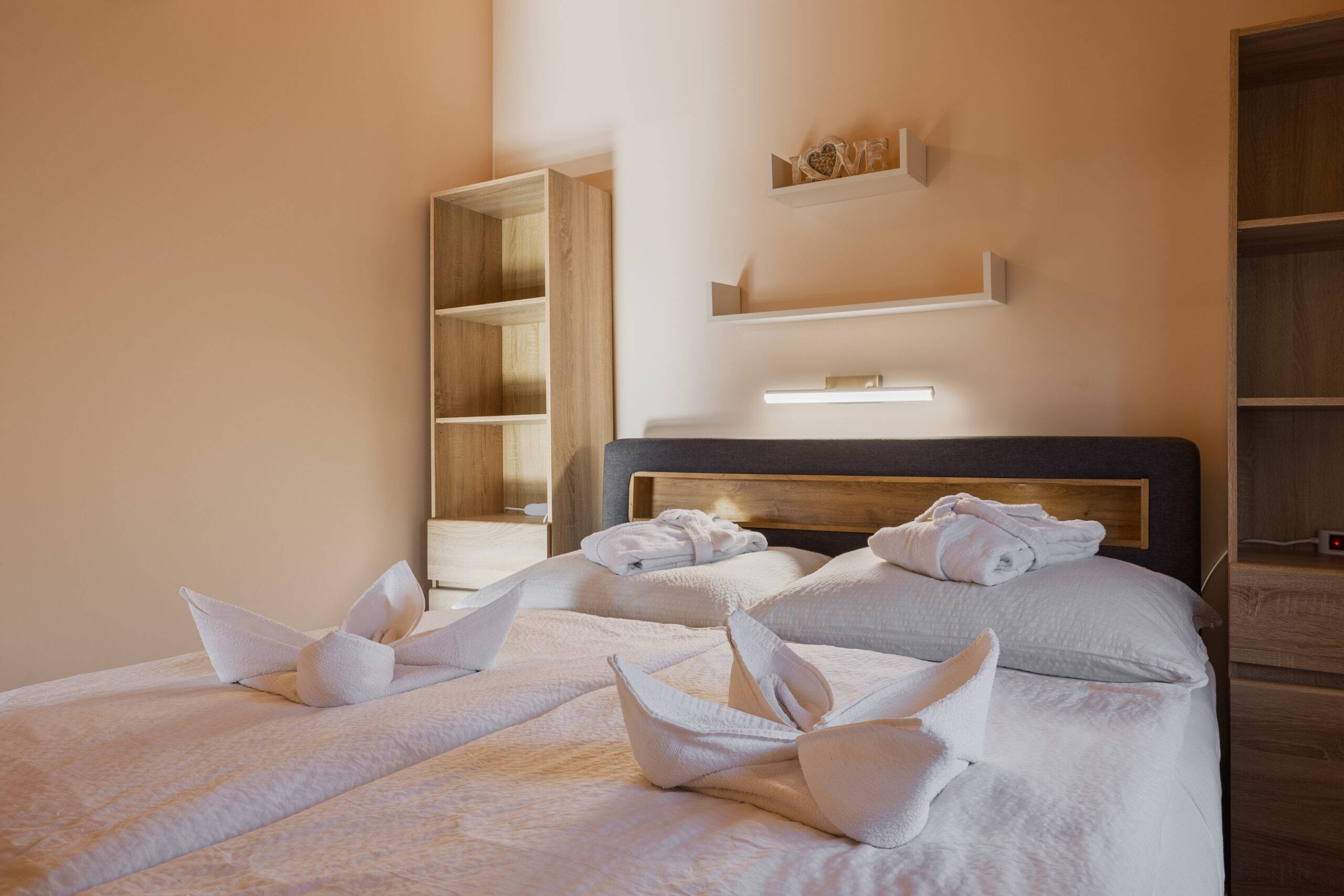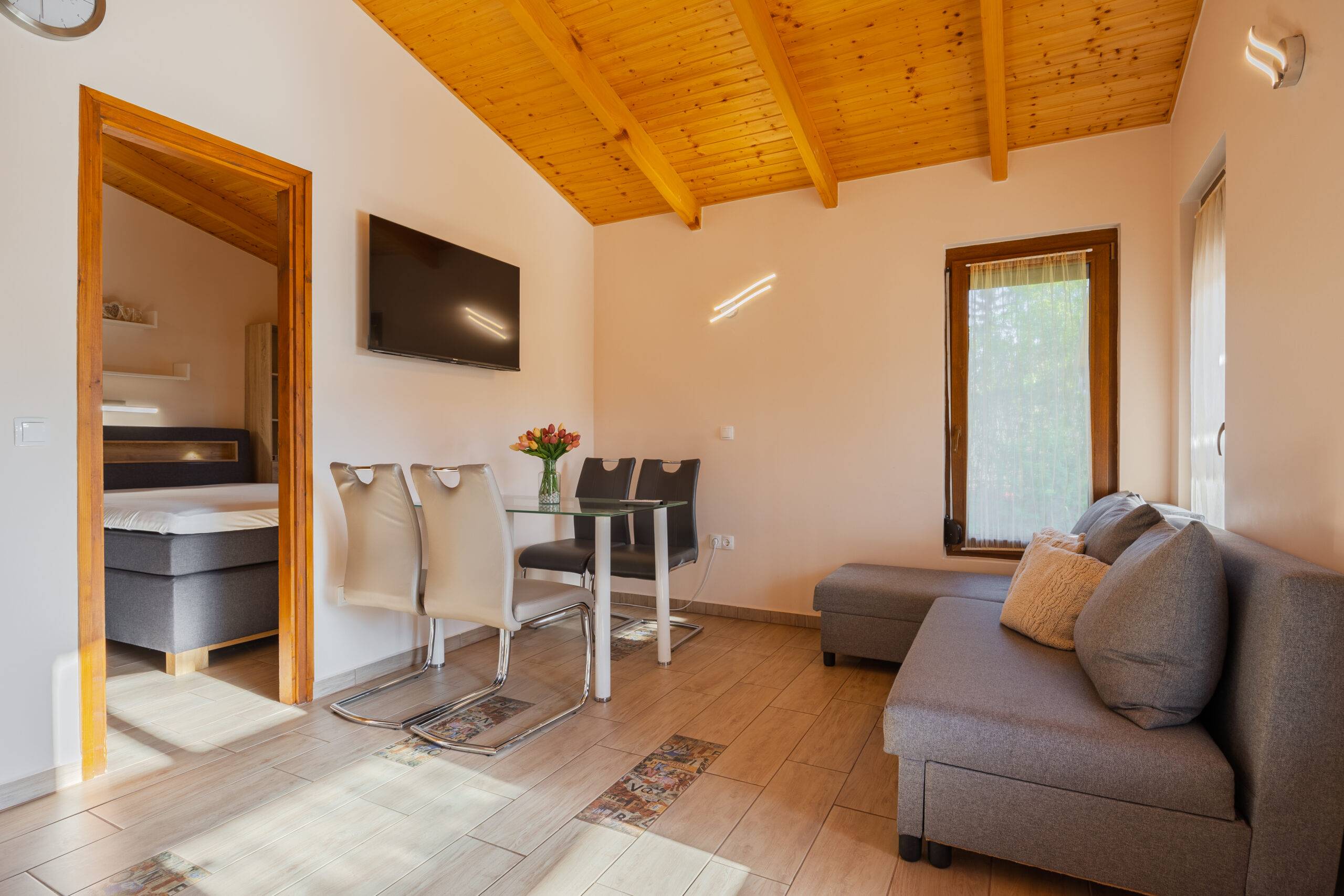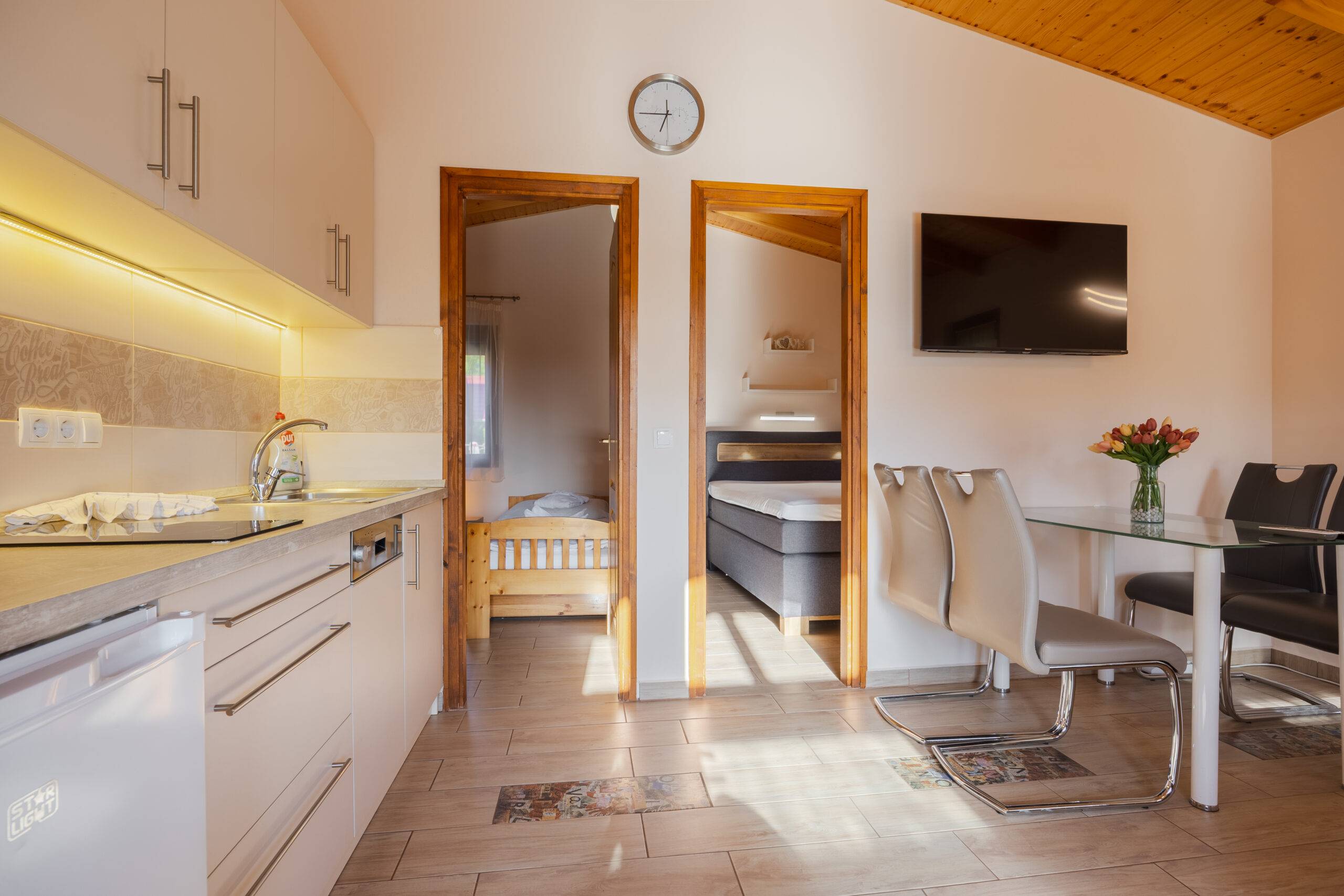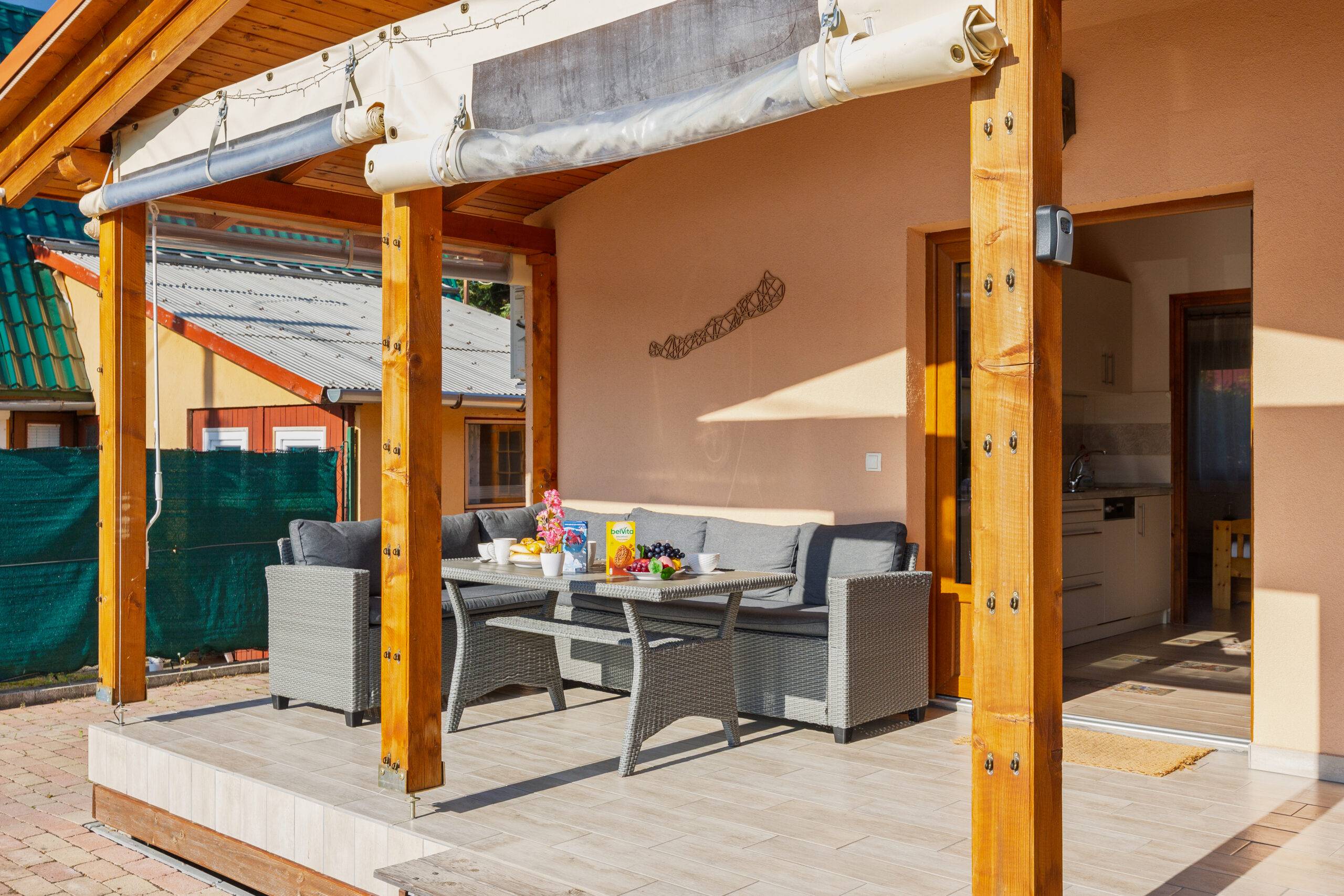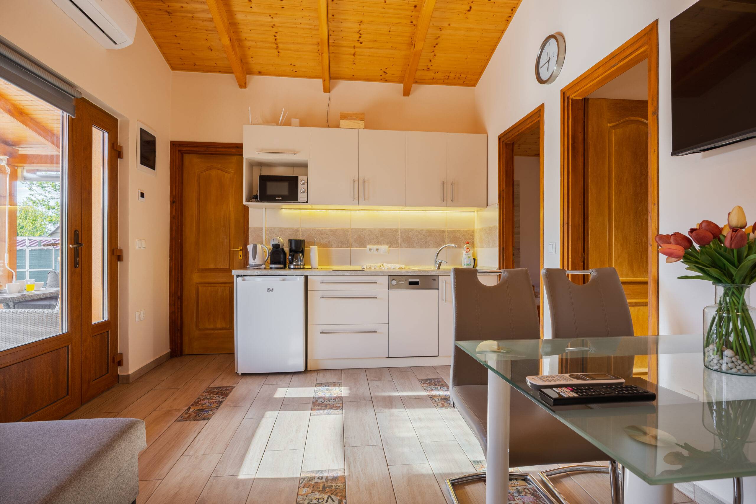 Az apartmanházban két hálószoba, amerikai konyhás nappali, valamint zuhanyzós fürdőszoba áll rendelkezésre a pihenni vágyók számára. Az apartmanhoz egy hangulatos nyugati fekvésű fedett terasz is tartozik, mely lehetővé teszi a feledhetetlen kiülős estéket kora tavasztól késő őszig.